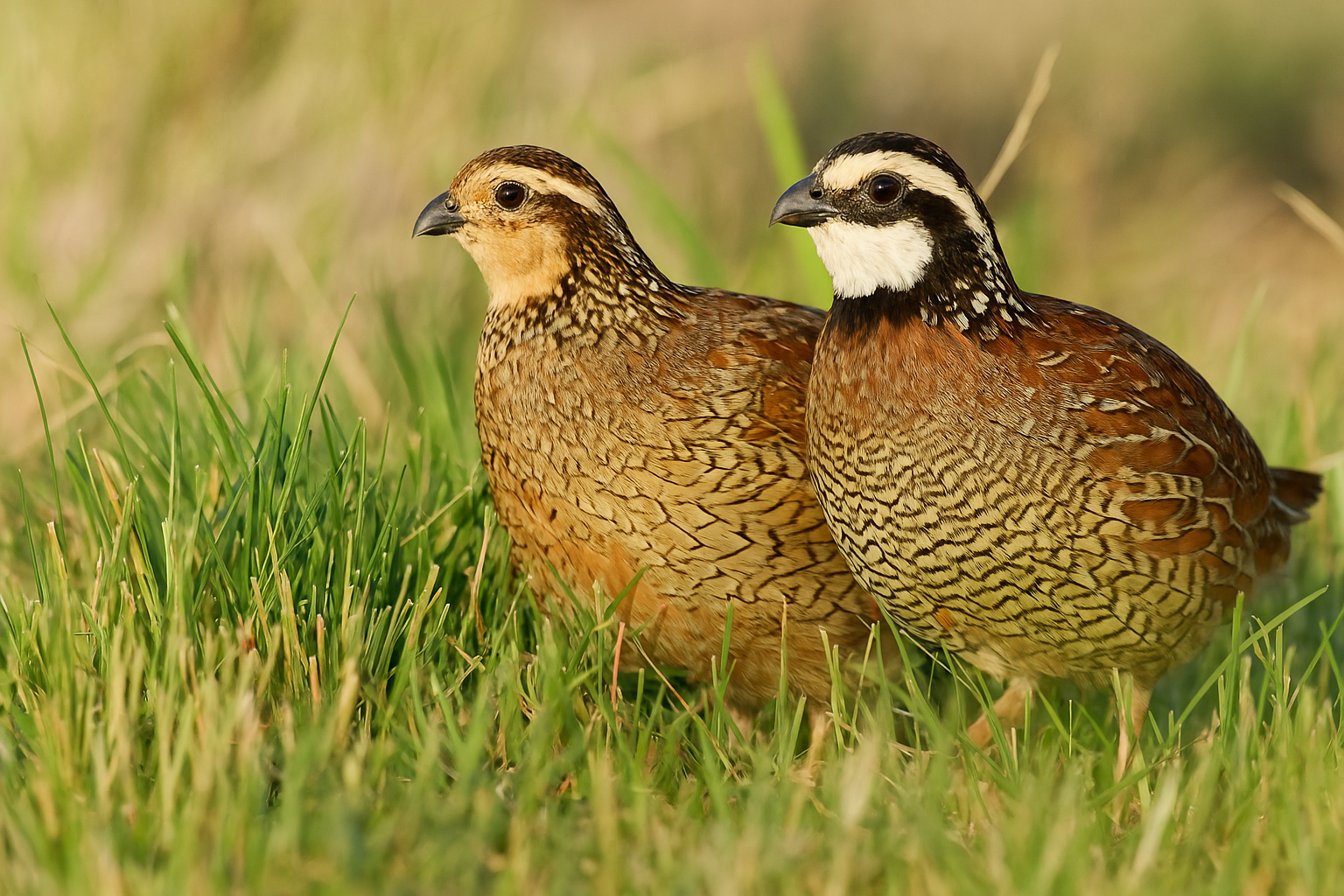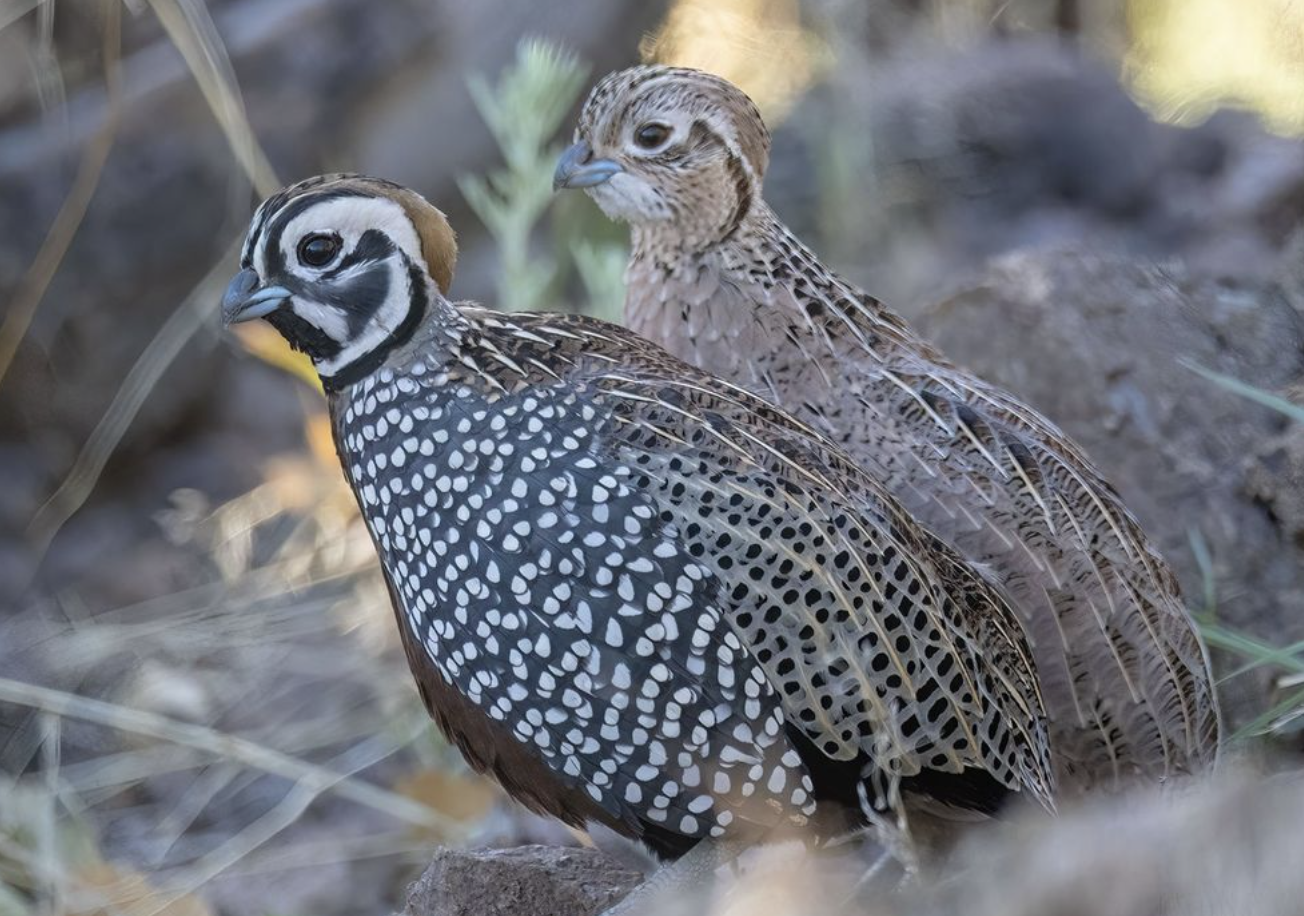 In bobwhite quail, males are distinguished by a white throat and a bold white stripe above their eyes, while females have a buff-colored throat and eye stripe, giving them a softer appearance. These differences are most apparent in adult birds. Sexing juveniles can be more challenging but becomes easier as they mature and develop their plumage.