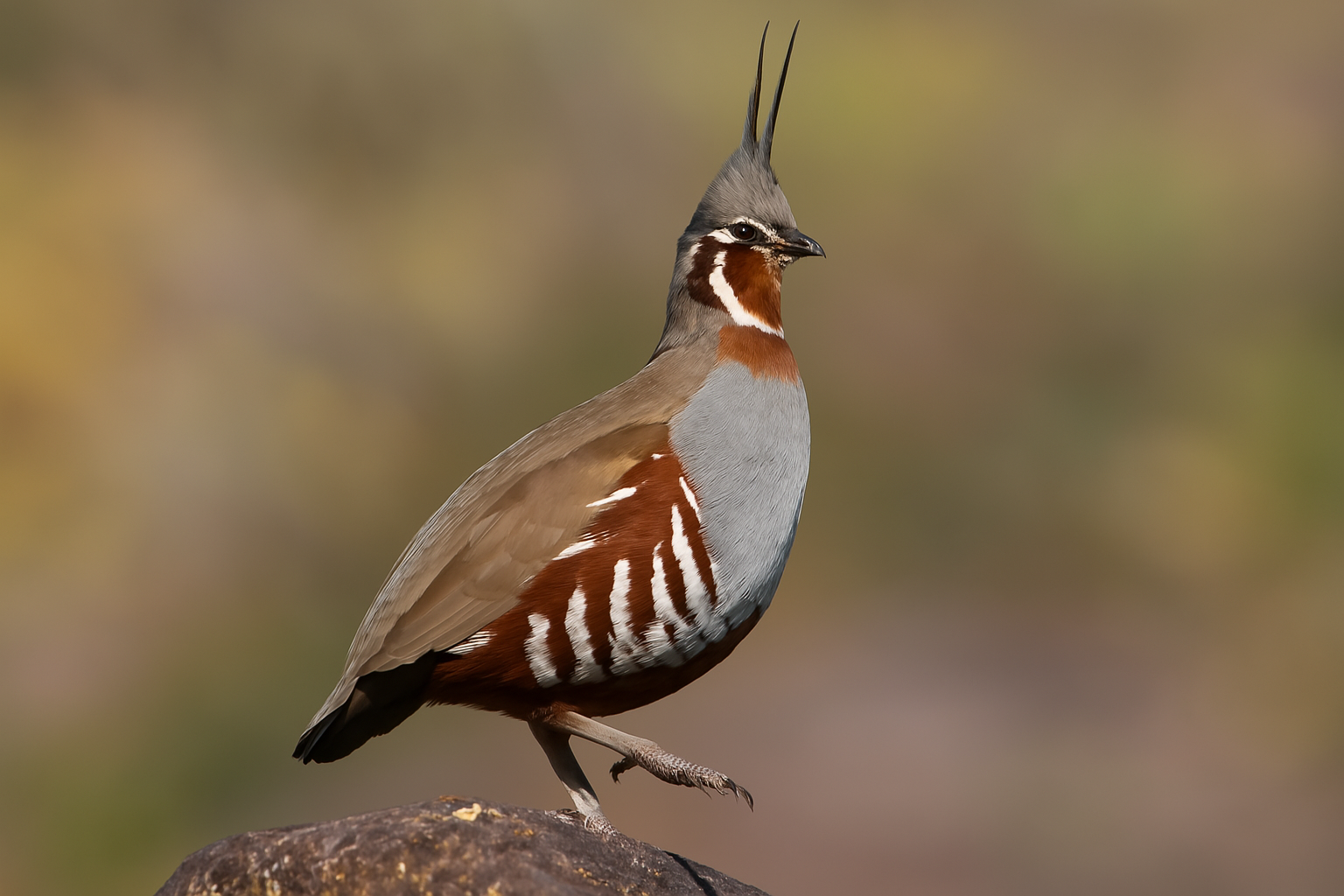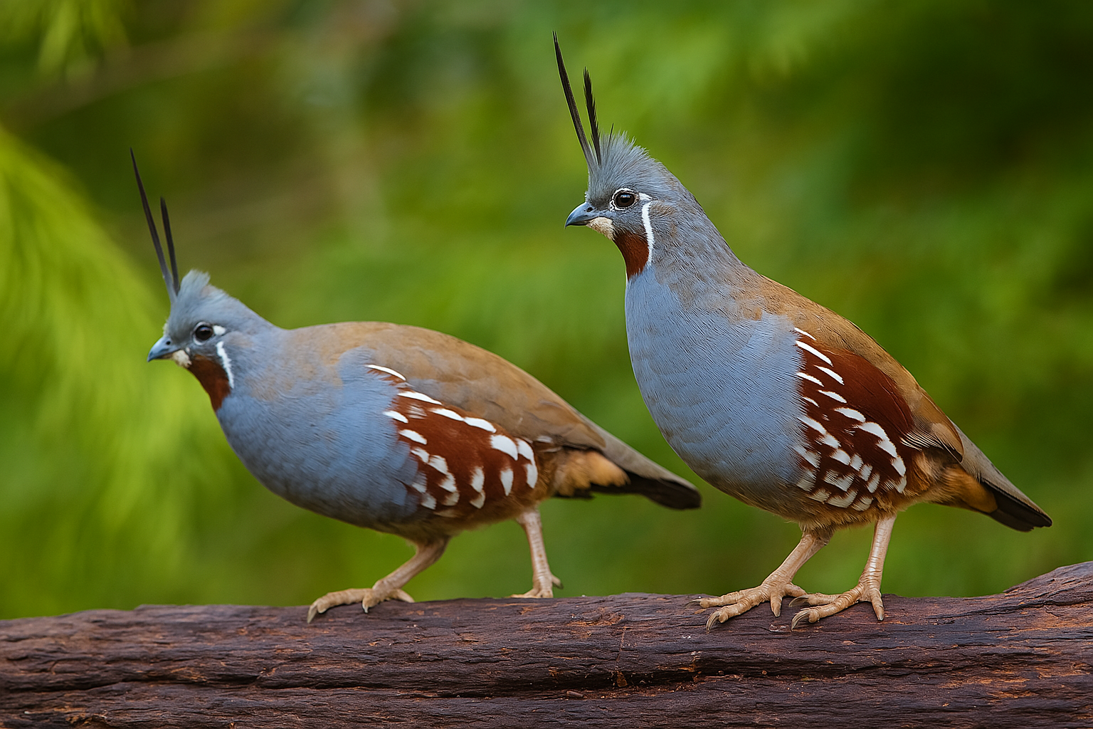 The Mountain Quail’s tall head plume reveals its mood. When the plume leans back, the bird is usually calm—feeding or resting, much like a dog with its ears down. When the plume stands upright, it signals alertness or agitation.