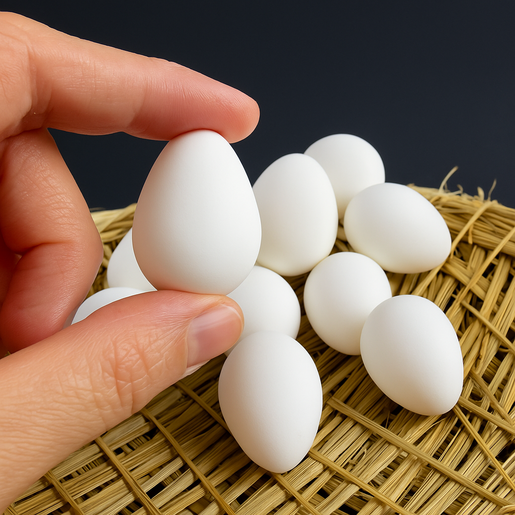 Mountain quail eggs are small, smooth, and typically white or very pale cream in color, lacking the speckled patterns seen in other quail species. They are about 3 cm (1.2 inches) in length and weigh around 10-12 grams, with a clean, simple appearance that contrasts beautifully with their natural nesting environments.