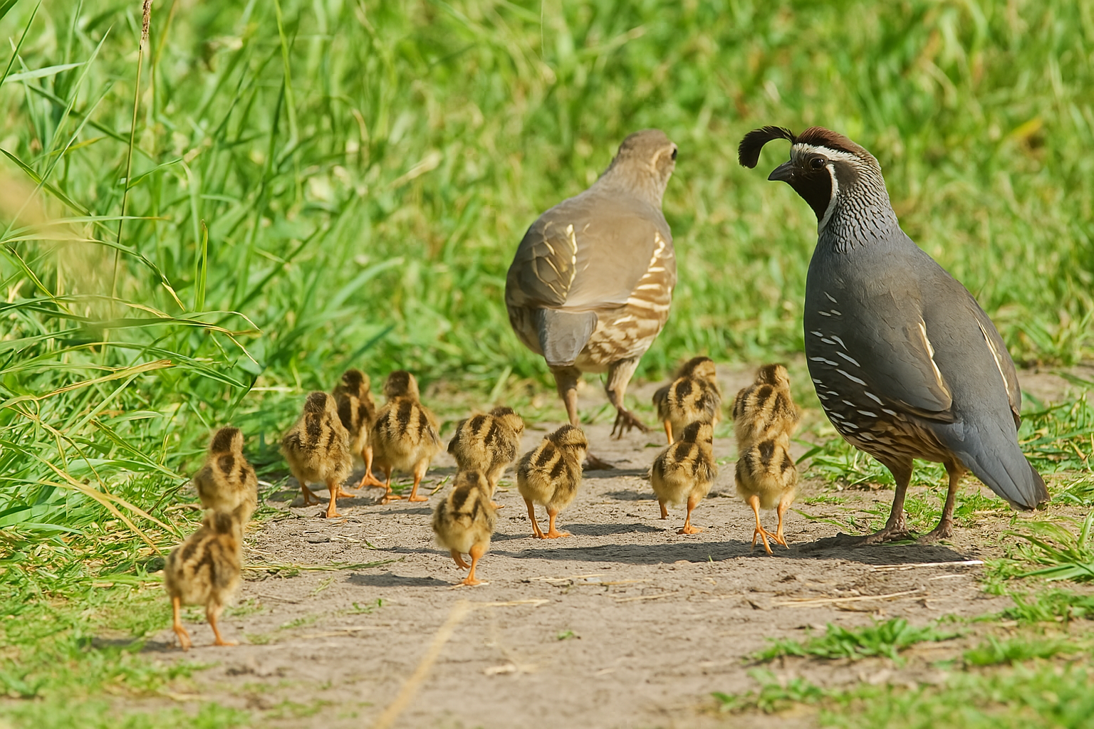 California Quail form "family coveys" during the breeding season. These are large, cooperative groups where multiple families come together. Adults share the responsibility of caring for and protecting the chicks, including those from different parents, demonstrating strong social bonds and increasing chick survival rates.